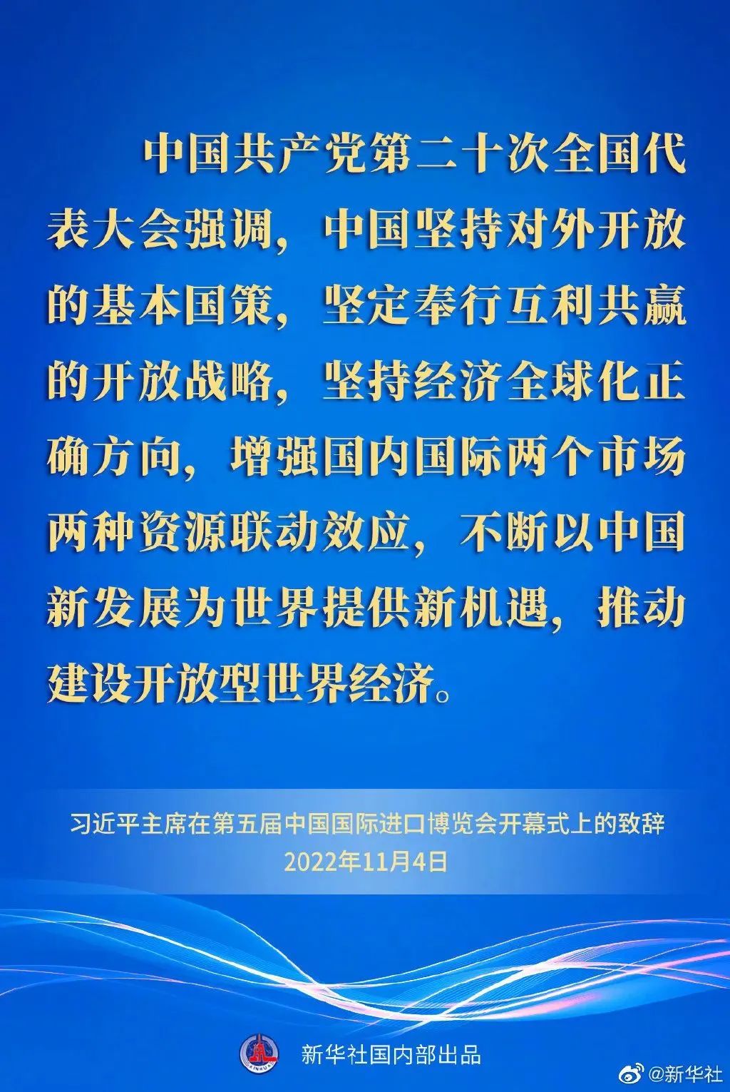 11月4日晚,國家主席習近平以視頻方式出席在上海舉行的第五屆中國國際進口博覽會開幕式并發表題為《共創開放繁榮的美好未來》的致辭。