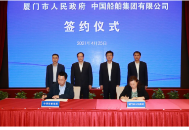 4月25日,中國(guó)船舶集團(tuán)與廈門(mén)市人民政府簽署了戰(zhàn)略合作協(xié)議。中國(guó)船舶集團(tuán)黨組副書(shū)記、總經(jīng)理?xiàng)罱鸪桑=ㄊ∥NB門(mén)市委書(shū)記趙龍,廈門(mén)市委常委、常務(wù)副市長(zhǎng)黃文輝出席了簽署儀式。中國(guó)船舶集團(tuán)黨組成員、副總經(jīng)理盛紀(jì)綱,廈門(mén)市副市長(zhǎng)張志紅分別代表雙方在協(xié)議上簽字。簽約前,雙方圍繞進(jìn)一步加強(qiáng)交流合作、實(shí)現(xiàn)共同發(fā)展進(jìn)行了溝通交流。