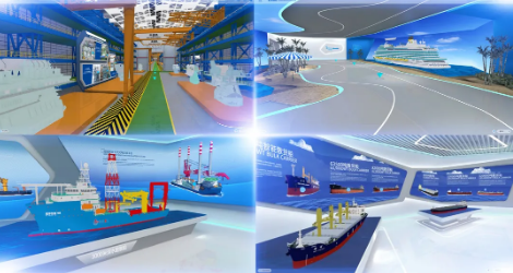 云展廳運用360度全景3D建模、沉浸式場景以及實時渲染等領先創新技術,打造了高端3A(“Anybody、Anytime、Anywhere”)展示平臺,特別是以實景還原的場景,動態展示大型郵輪、液化天然氣(LNG)船、雪龍2號、奮斗者號等亮點產品,為參觀者營造了身臨其境的逼真效果。