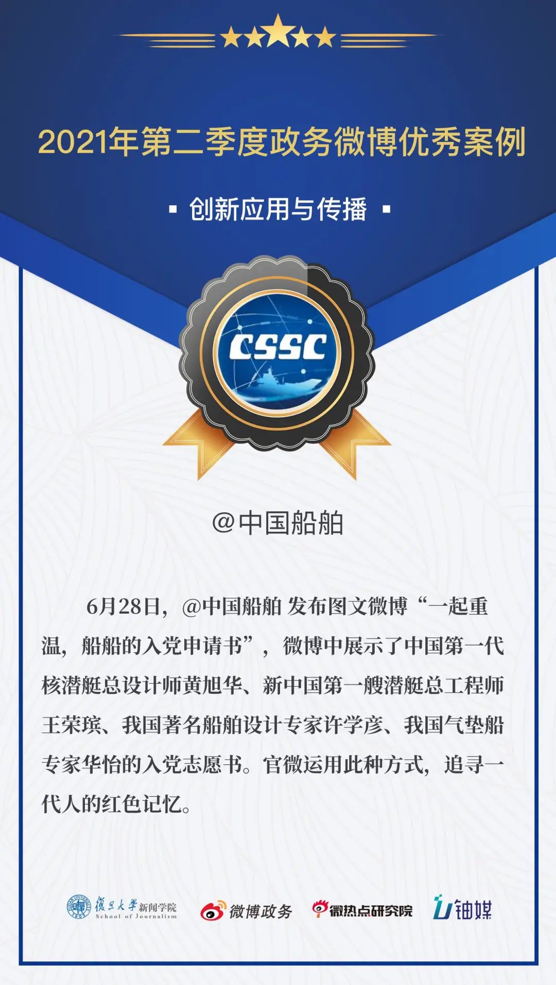 在幾百個(gè)微博政務(wù)賬號(hào)、幾千個(gè)微博政務(wù)優(yōu)秀案例的評(píng)選中,@中國船舶 憑借圖文微博“一起重溫,船船的入黨申請書”,再一次拿下“創(chuàng)新應(yīng)用與傳播”的獎(jiǎng)勵(lì),真的是太棒了!