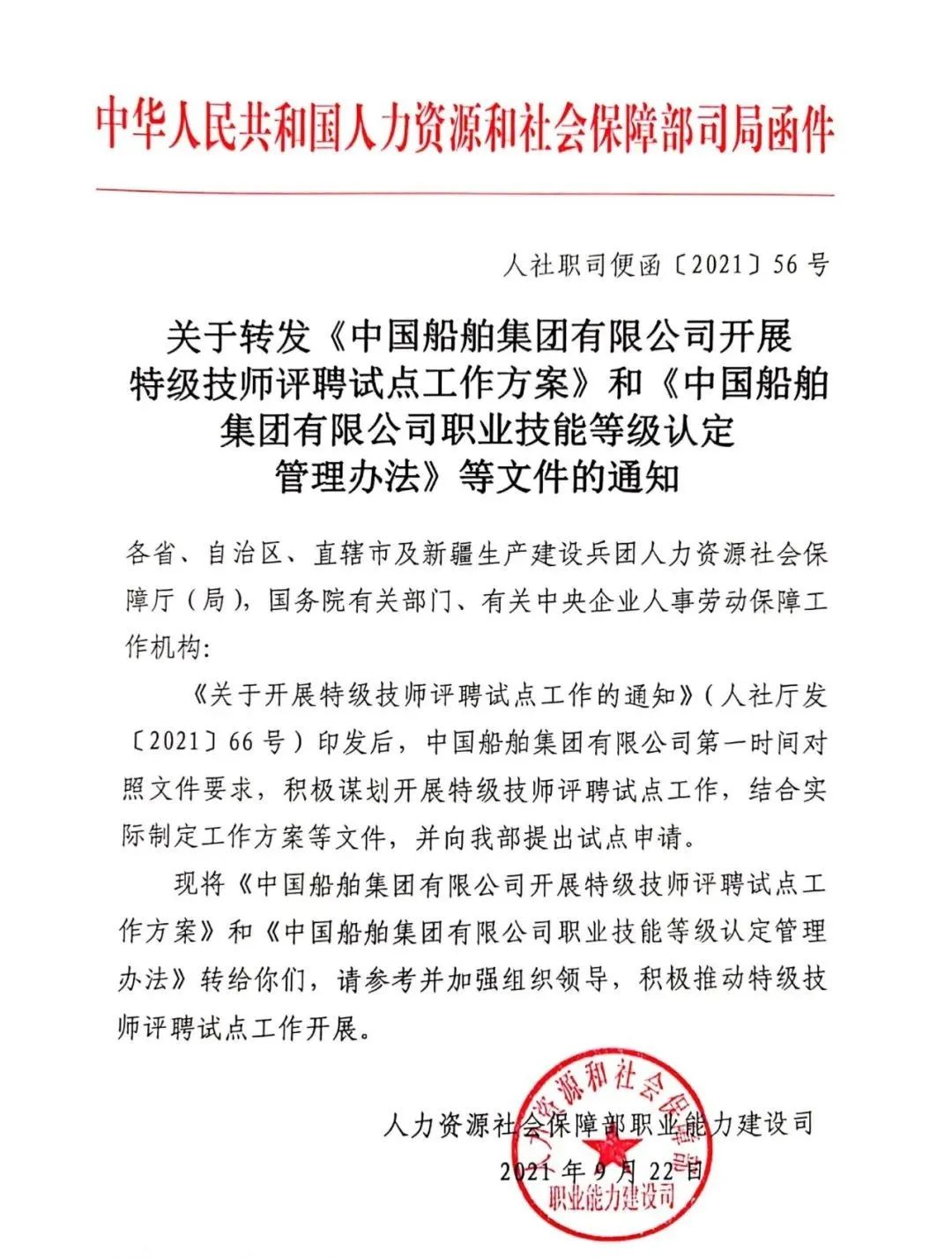 通知發布后,中國船舶集團第一時間對照文件要求,積極謀劃開展特級技師評聘試點工作,集團公司黨組審議出臺《職業技能等級認定管理辦法》,進一步明確以“特級技師”為塔尖的六個技能等級,第一時間制定特級評聘工作方案,積極向人社部申報特級技師評聘試點。同時部署了2021年特級技師評審工作,今年計劃增加80名左右特級技師。