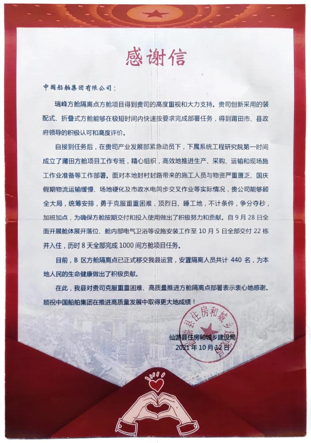 在此,我縣對(duì)貴司克服重重困難、高質(zhì)量推進(jìn)方艙隔離點(diǎn)部署表示衷心地感謝。順祝中國(guó)船舶集團(tuán)在推進(jìn)高質(zhì)量發(fā)展中取得更大地成績(jī)!