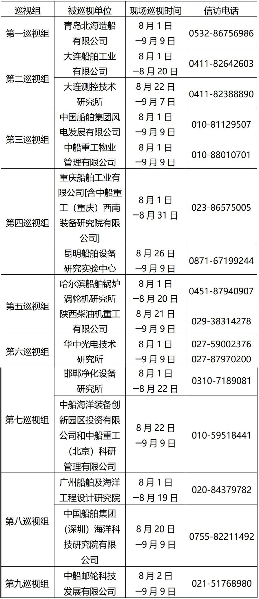 根據(jù)中國船舶集團(tuán)黨組2022年第一輪巡視工作部署,截至2022年8月2日,中國船舶集團(tuán)黨組9個(gè)巡視組已進(jìn)駐青島北海造船有限公司、大連船舶工業(yè)有限公司、中國船舶集團(tuán)風(fēng)電發(fā)展有限公司、中船重工物業(yè)管理有限公司、重慶船舶工業(yè)有限公司[含中船重工(重慶)西南裝備研究院有限公司]、哈爾濱船舶鍋爐渦輪機(jī)研究所、華中光電技術(shù)研究所、邯鄲凈化設(shè)備研究所、廣州船舶及海洋工程設(shè)計(jì)研究院、中船郵輪科技發(fā)展有限公司等單位,對(duì)其黨組織開展為期40天左右的現(xiàn)場(chǎng)巡視。巡視期間,巡視組設(shè)置專門值班電話(具體如下表)。同時(shí)在巡視組工作現(xiàn)場(chǎng)設(shè)置聯(lián)系信箱,廣大干部職工可以反映情況。