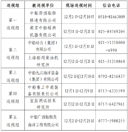 根據(jù)中國船舶集團(tuán)黨組2022年第二輪巡視工作部署,截至2022年12月2日,中國船舶集團(tuán)黨組5個巡視組已進(jìn)駐中船澄西船舶修造有限公司、中船動力(集團(tuán))有限公司、中船九江海洋裝備(集團(tuán))有限公司、中船重工中南裝備有限責(zé)任公司、中船廣西船舶及海洋工程有限公司等單位,開展為期20天左右的巡視“回頭看”。巡視期間,巡視組設(shè)置專門值班電話(具體如下表),同時在巡視組工作現(xiàn)場設(shè)置聯(lián)系信箱,廣大干部職工可以反映情況。