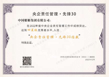 2022年12月20日,由國(guó)務(wù)院國(guó)資委社會(huì)責(zé)任局主辦、中國(guó)社會(huì)責(zé)任百人論壇承辦的“新征程 新責(zé)任——《中央企業(yè)社會(huì)責(zé)任藍(lán)皮書(2022)》《國(guó)資國(guó)企社會(huì)責(zé)任藍(lán)皮書(2022)》發(fā)布活動(dòng)”在京舉行。活動(dòng)以“云端會(huì)議”的方式舉辦,發(fā)布了“央企責(zé)任管理 · 先鋒30指數(shù)”,中國(guó)船舶集團(tuán)入選該指數(shù)。