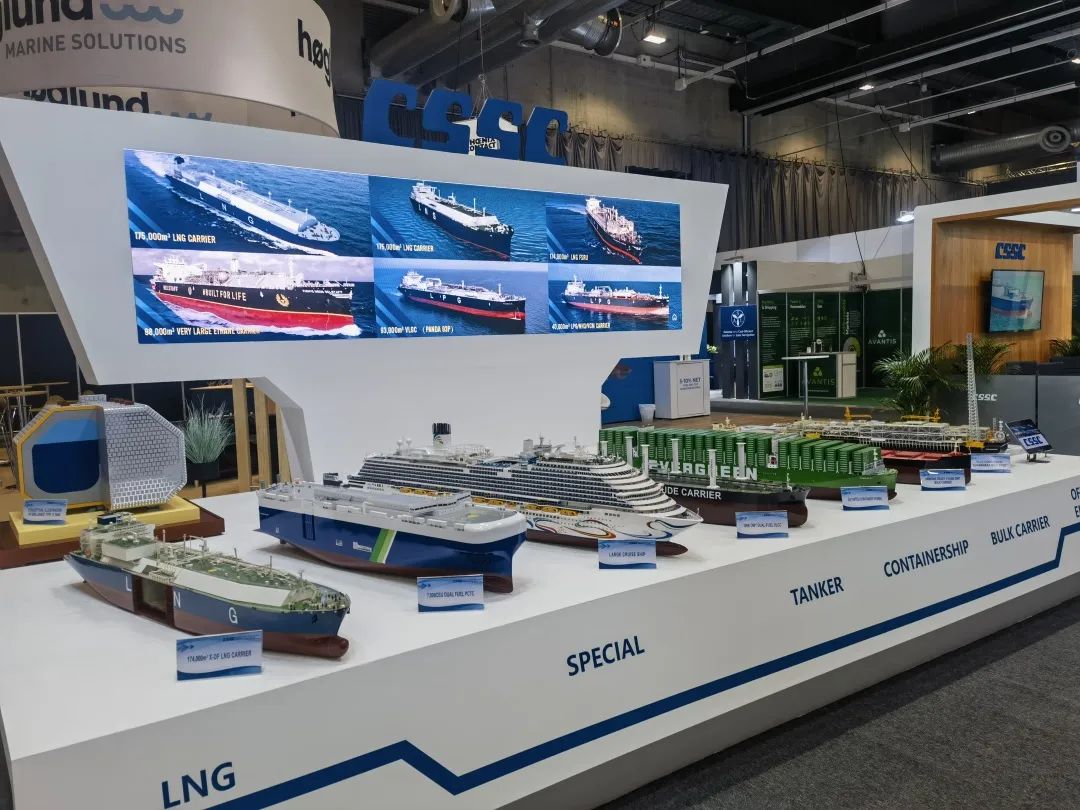 本次展會,中國船舶集團積極踐行“走出去”發(fā)展戰(zhàn)略,緊盯目標市場特點和需求,重點展示了近年來船舶海工及動力機電產(chǎn)品在綠色、低碳、環(huán)保方面取得的最新進展和相關成果,包括全球首制7500立方米液態(tài)二氧化碳運輸船、17.4萬立方米大型LNG運輸船、7000CEU雙燃料汽車滾裝船、23000TEU超大型雙燃料集裝箱船、21萬噸氨燃料散貨船、30萬噸級FPSO、全球首艘10萬噸級智慧養(yǎng)殖工船,以及 12X92DF雙燃料低速機、LNG供氣系統(tǒng)、船用碳捕捉系統(tǒng)等。集團公司展臺吸引了眾多國內外知名船東、船級社、設備廠商等到訪觀摩,交流了當前市場熱點并探討了未來合作機遇。