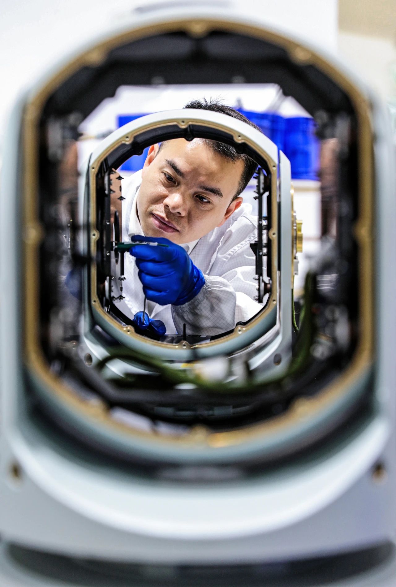七一七所技術人員正在裝調光軸,確保光路的穩(wěn)定傳導,在精確裝調中堅守本心、求精求新,以匠心確保產(chǎn)品精度。