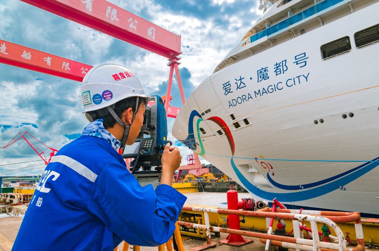 精度技術部的員工正在監(jiān)測國產(chǎn)首艘大型郵輪試航歸來時的精準坐墩數(shù)據(jù)。