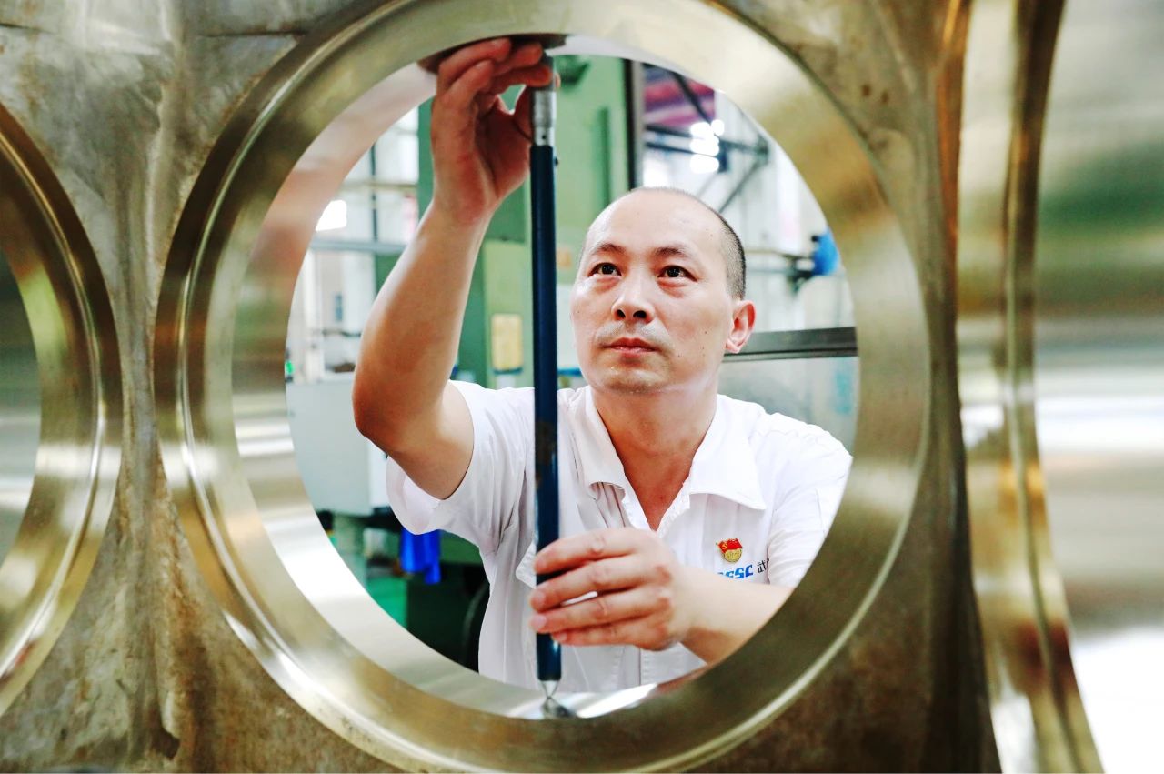 在武漢船機平臺生產(chǎn)現(xiàn)場,一名機床操作師傅,正在對加工后的零件進行檢測,專注的表情展現(xiàn)了船舶人嚴把質量關,人品以誠心為本,企品以恒心為要,產(chǎn)品以匠心為重的精神風貌。