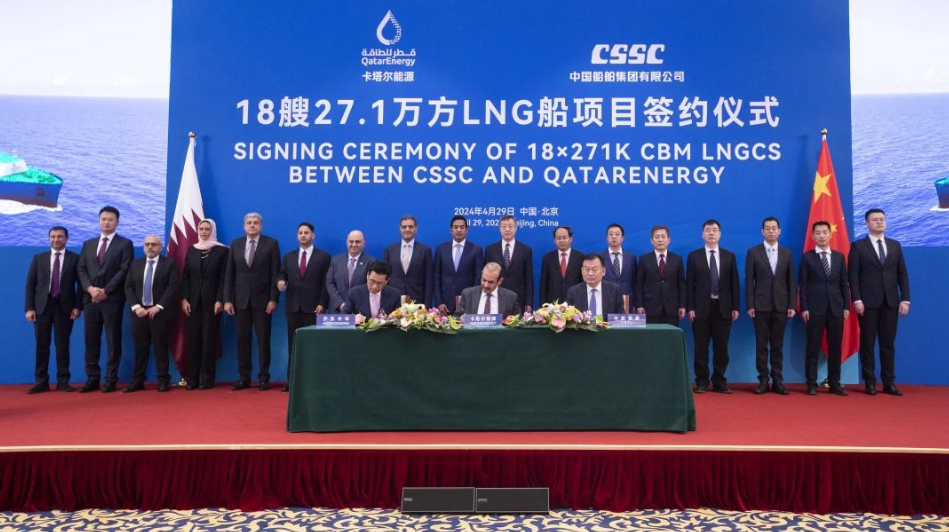 4月29日,中國船舶集團有限公司與卡塔爾能源在京舉行18艘全球最大27.1萬立方米超大型液化天然氣(LNG)運輸船項目簽約儀式。工業(yè)和信息化部副部長單忠德,外交部西亞北非司大使呂健,中國船舶集團董事長溫剛、副總經(jīng)理盛紀綱,卡塔爾能源事務(wù)國務(wù)大臣、卡塔爾能源總裁兼首席執(zhí)行官薩阿德·謝里達·阿爾卡比,卡塔爾能源天然氣首席執(zhí)行官卡利德·阿爾-塞尼,卡塔爾能源商務(wù)和業(yè)務(wù)發(fā)展執(zhí)行副總裁賈西姆·阿爾馬拉祖齊等領(lǐng)導(dǎo)和嘉賓出席簽約儀式。