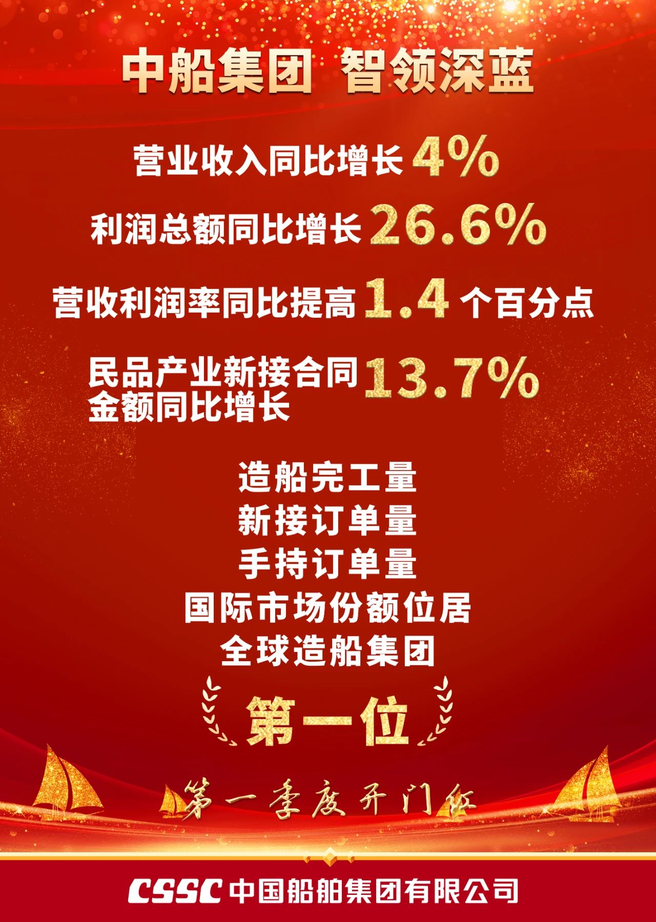 一季度,中船集團(tuán)營業(yè)收入同比增長4%,利潤總額同比增長26.6%,營收利潤率同比提高1.4個(gè)百分點(diǎn),民品產(chǎn)業(yè)新接合同金額同比增長13.7%,造船完工量、新接訂單量、手持訂單量國際市場份額位居全球造船集團(tuán)第一位,收獲首季開門紅。