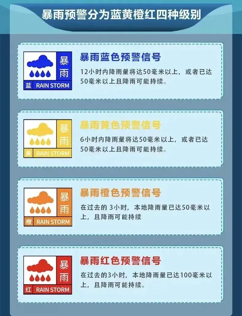 暴雨預(yù)警信號是氣象部門通過氣象監(jiān)測,在暴雨到來之前做出的預(yù)警信號,暴雨預(yù)警信號分四級,分別以藍(lán)色、黃色、橙色、紅色表示。