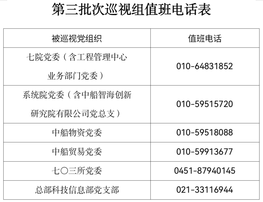 巡視期間,集團公司黨組巡視組設置值班電話和聯(lián)系信箱,主要受理反映被巡視黨組織領(lǐng)導班子及其成員、下一級黨組織領(lǐng)導班子主要負責人和重點崗位領(lǐng)導干部問題的來信、來電、來訪,重點關(guān)注違反政治紀律、組織紀律、廉潔紀律、群眾紀律、工作紀律、生活紀律以及巡視整改等方面問題反映。第三批次巡視受理信訪截止時間為9月22日。