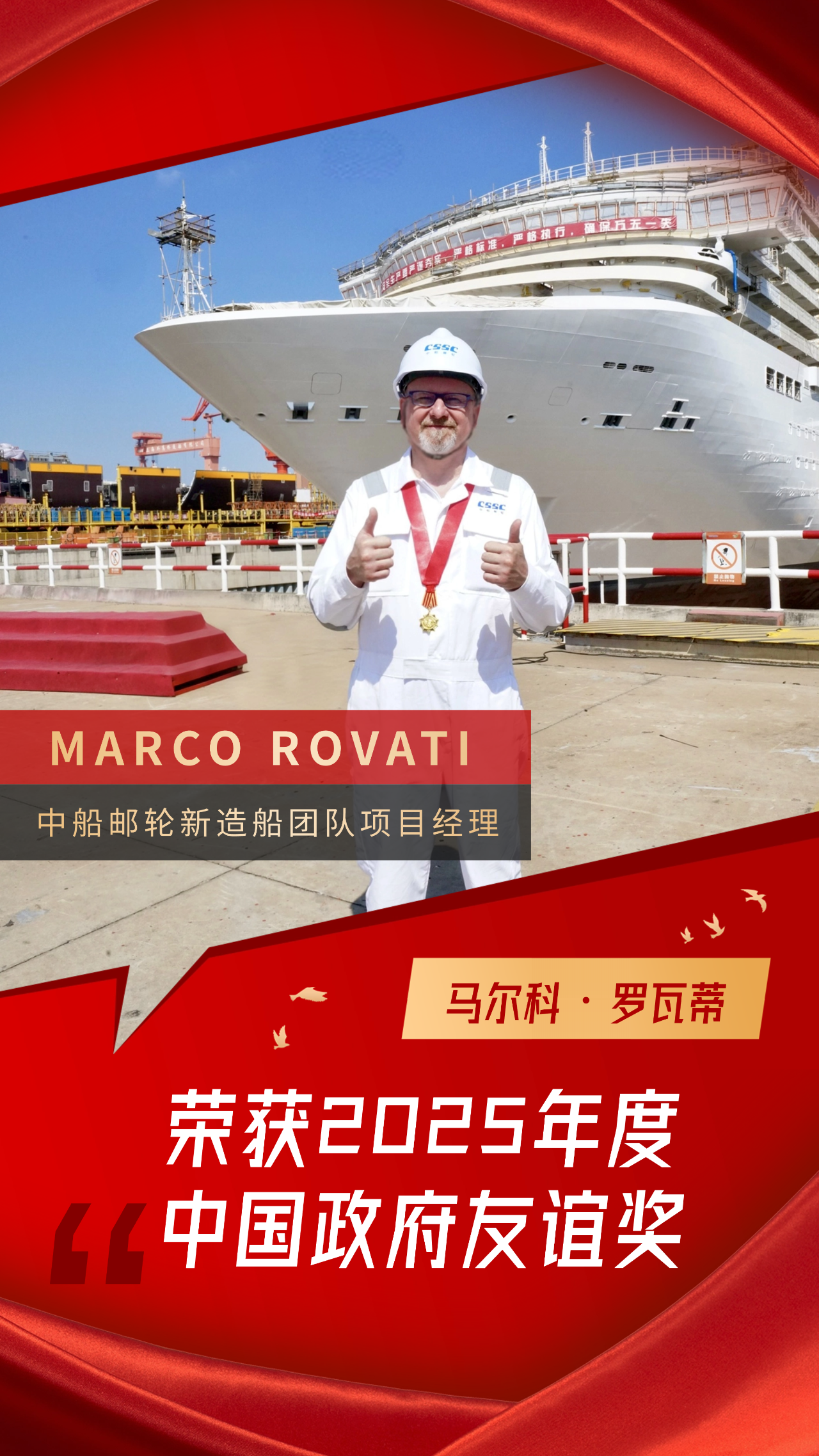 MARCO ROVATI是一位出生于1967年的克羅地亞籍郵輪工程專家,擁有超過三十年的郵輪新造船經驗。在獲得中國政府友誼獎后,MARCO ROVATI說:“中國政府友誼獎是我職業生涯中獲得的最重要的榮譽,對我而言具有非凡意義。這份獎項不僅是對我過去工作的認可,更是對我未來的激勵。我將繼續為中國郵輪產業的發展貢獻自己的力量。”