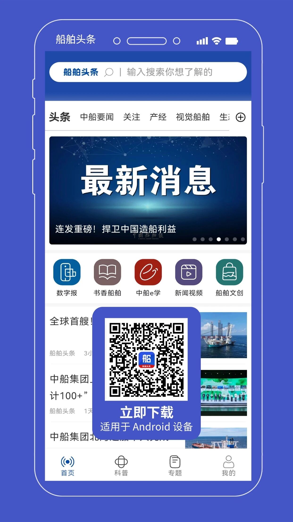 “船舶頭條”App聚焦海洋裝備產業(yè)鏈,集新聞發(fā)布、融合傳播、專業(yè)解讀、科普宣傳、企業(yè)智庫、服務聚合等功能為一體,設有“頭條”“中船要聞”“關注”“產經”“視覺船舶”“生態(tài)圈”6個精品頻道以及“科普”“專題”等功能版塊,并鏈接“書香船舶”“《中國船舶報》數字報”“中船e學”“新聞視頻”“船舶文創(chuàng)”等多個服務端口,目前支持安卓系統(tǒng)下載使用。