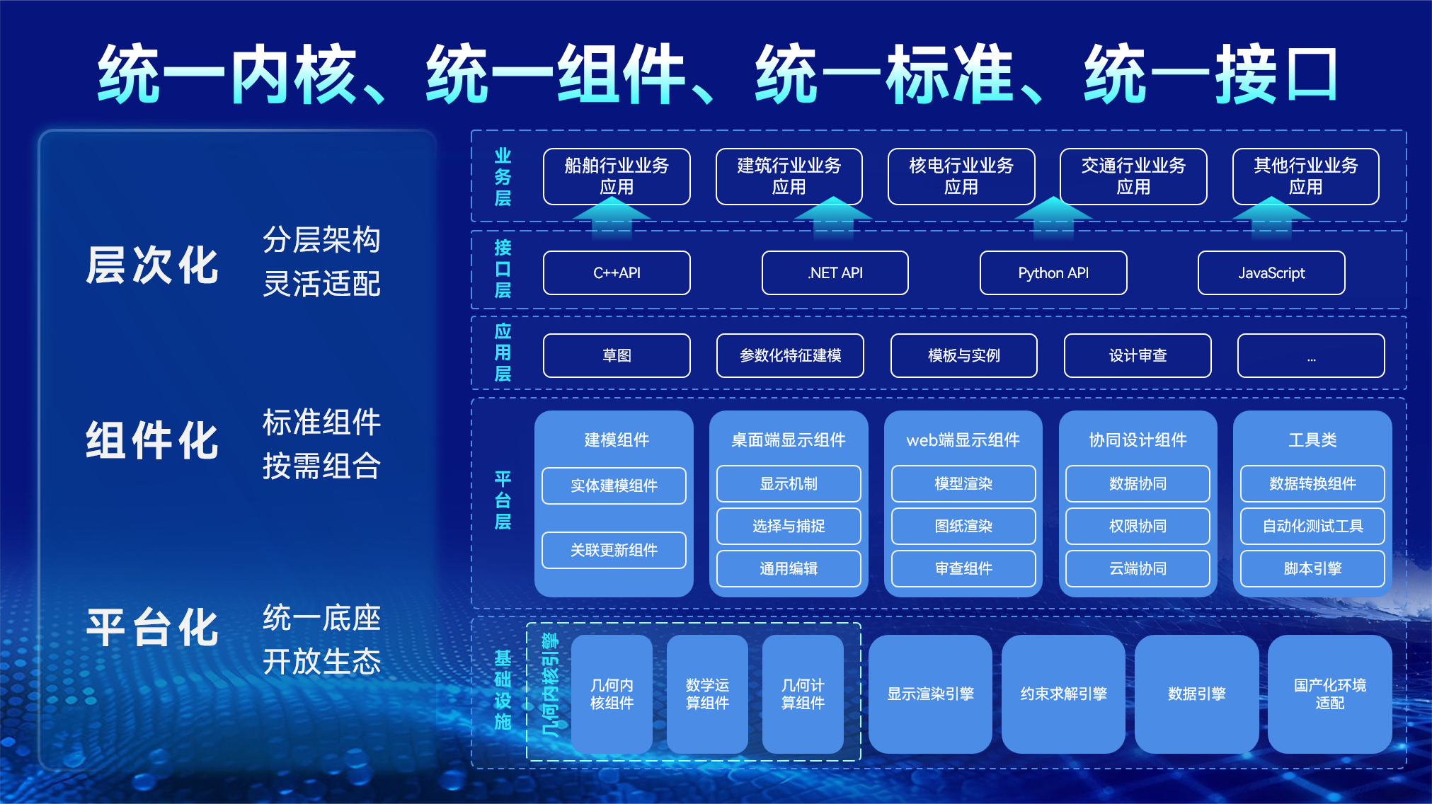 平臺確立了:統一內核、統一組件、統一標準、統一接口的體系化架構。