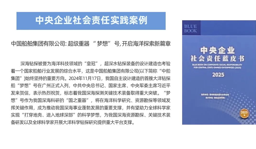 中船集團申報的《超級重器“夢想”號,開啟海洋探索新篇章》,聚焦國之重器建造歷程,闡述了“夢想”號在海洋科學研究、深海資源勘探等領(lǐng)域的關(guān)鍵作用,成功入選《中央企業(yè)社會責任藍皮書(2025)》中央企業(yè)社會責任實踐案例。