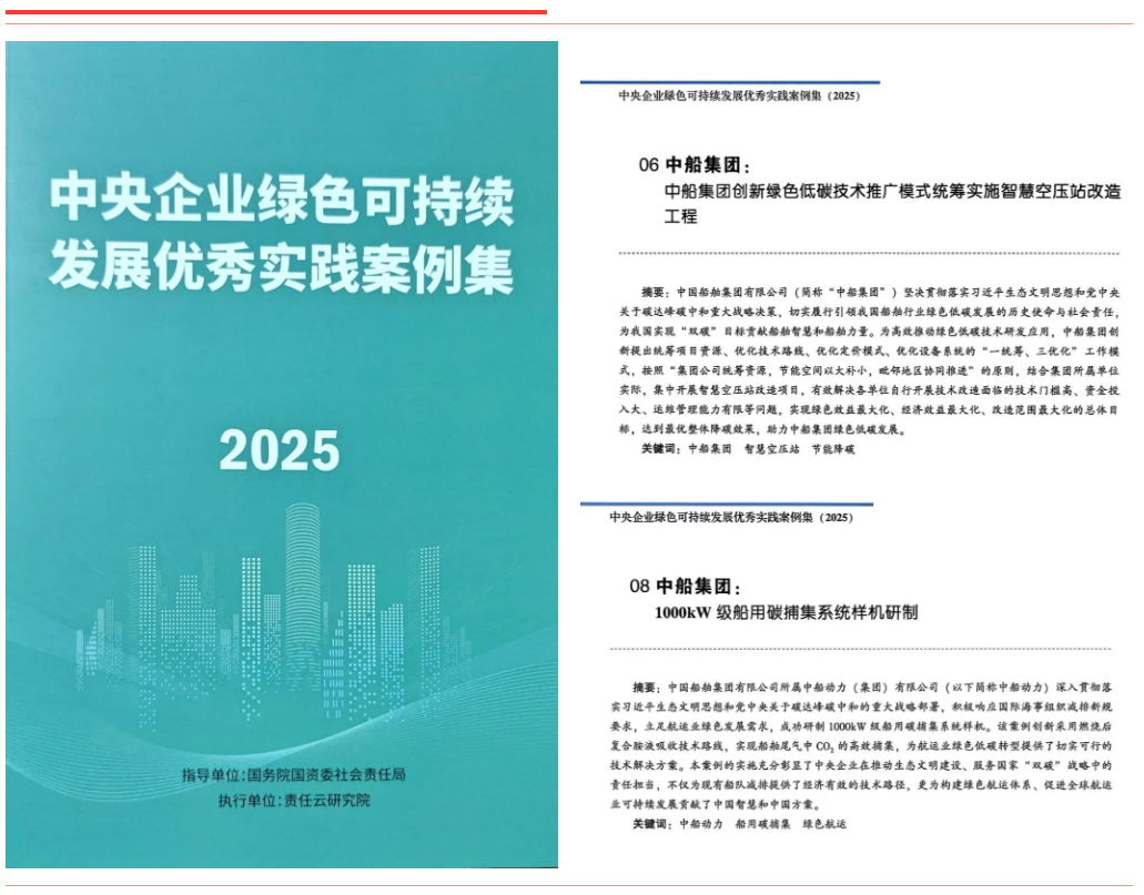 《中船集團創新綠色低碳技術推廣模式 統籌實施智慧空壓站改造工程》通過系統推進智慧空壓站改造,創新“一統籌、三優化”模式,大幅提升設備能效。《中船動力1000kW級船用碳捕集系統樣機研制》圍繞船用碳捕集關鍵技術開展攻關,采用燃燒后復合胺吸收工藝,實現CO?捕集率超85%、純度達99.9%。上述兩項案例入選《中央企業綠色可持續發展優秀實踐案例集(2025)》。
