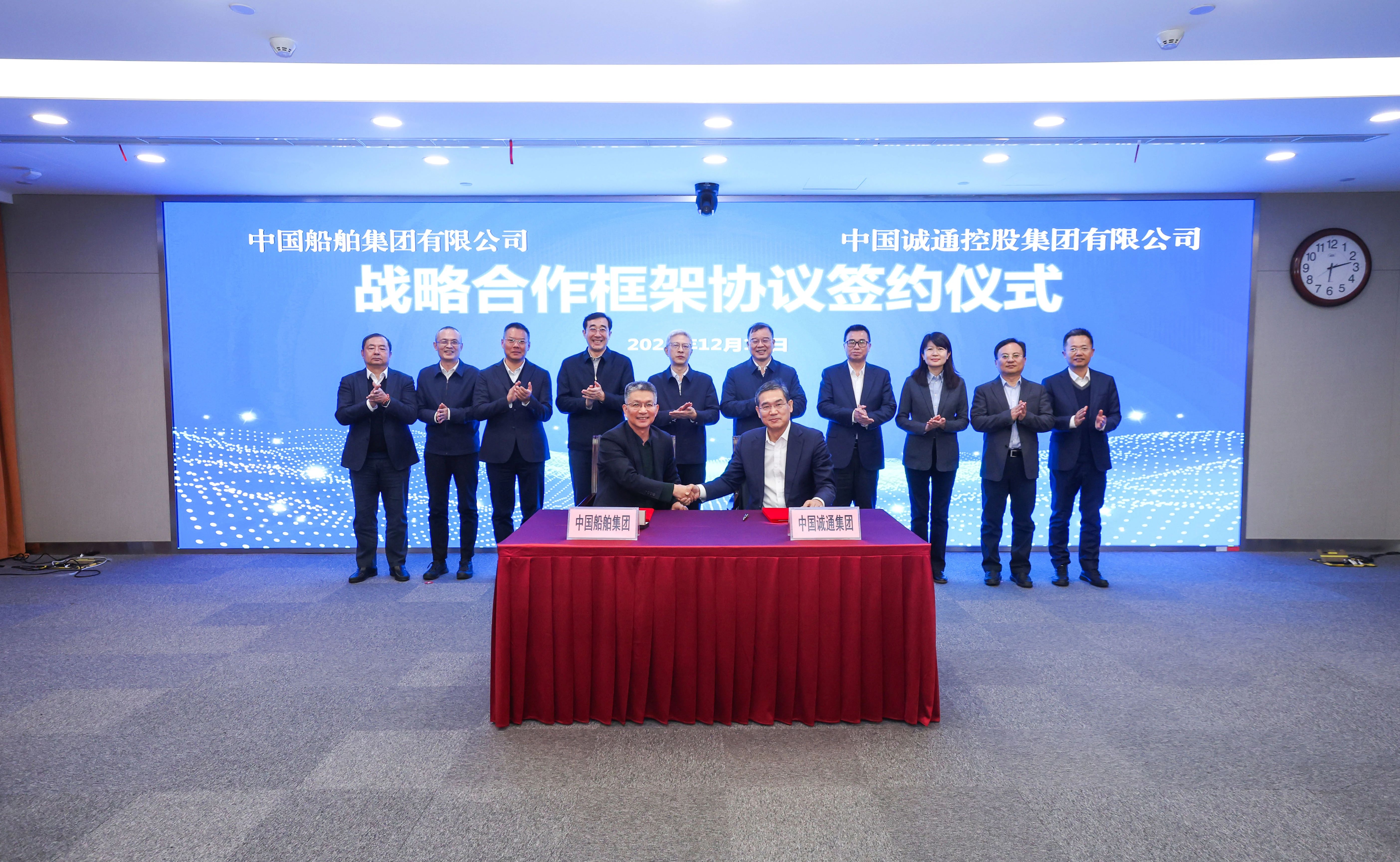 12月16日,中國船舶集團有限公司與中國誠通控股集團有限公司在上海簽署戰略合作框架協議。中船集團黨組書記、董事長徐鵬,中國誠通集團黨委書記、董事長奚正平,黨委委員、副總經理童來明出席簽約儀式。中船集團黨組成員、總會計師朱永紅,中國誠通集團副總經理、總法律顧問唐國良分別代表雙方在協議上簽字。簽約前,雙方就進一步加強溝通交流、深化多領域合作進行了交流探討。
