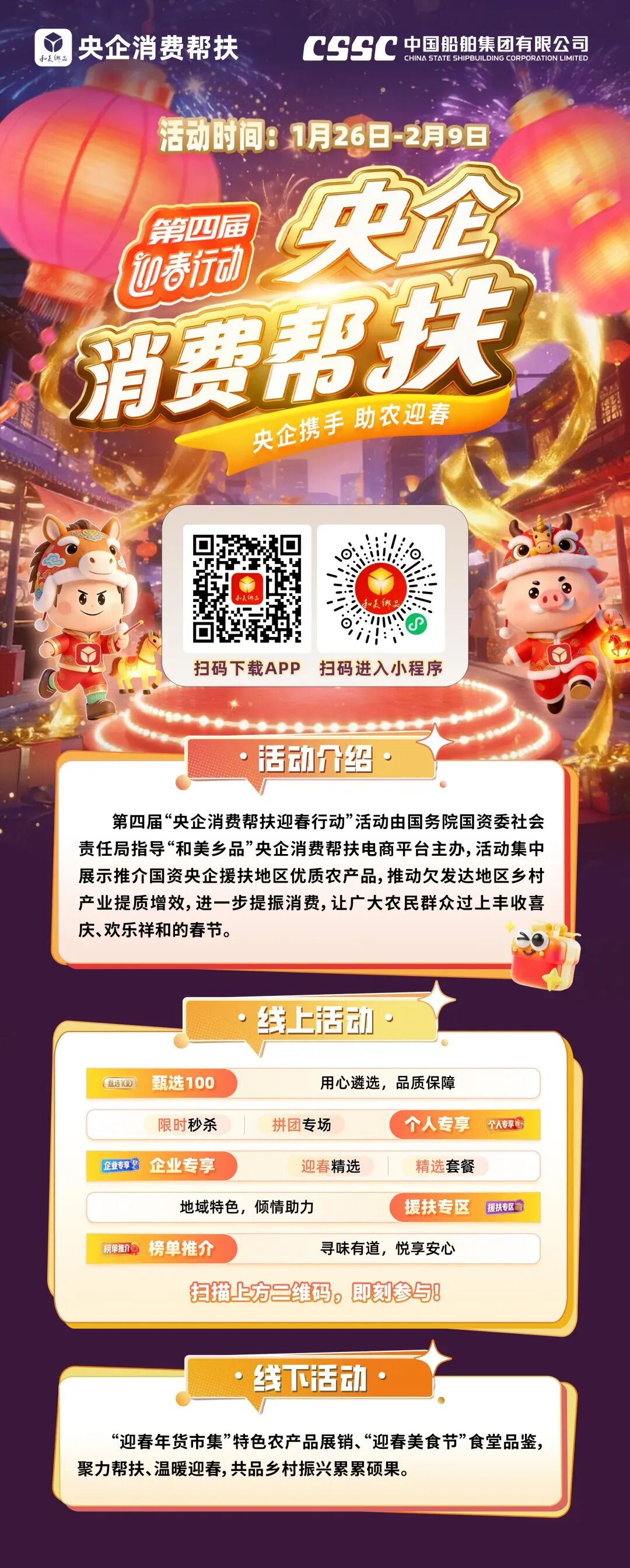 為深入貫徹黨中央、國(guó)務(wù)院關(guān)于消費(fèi)幫扶的決策部署,落實(shí)國(guó)資委相關(guān)工作要求,中船集團(tuán)積極組織參與2026“央企消費(fèi)幫扶迎春活動(dòng)”,以消費(fèi)幫扶持續(xù)鞏固拓展脫貧攻堅(jiān)成果、助力鄉(xiāng)村振興,鼓勵(lì)各單位及員工踴躍參與,推動(dòng)幫扶地區(qū)群眾穩(wěn)定增收,讓廣大農(nóng)民群眾共享發(fā)展成果、歡度新春。