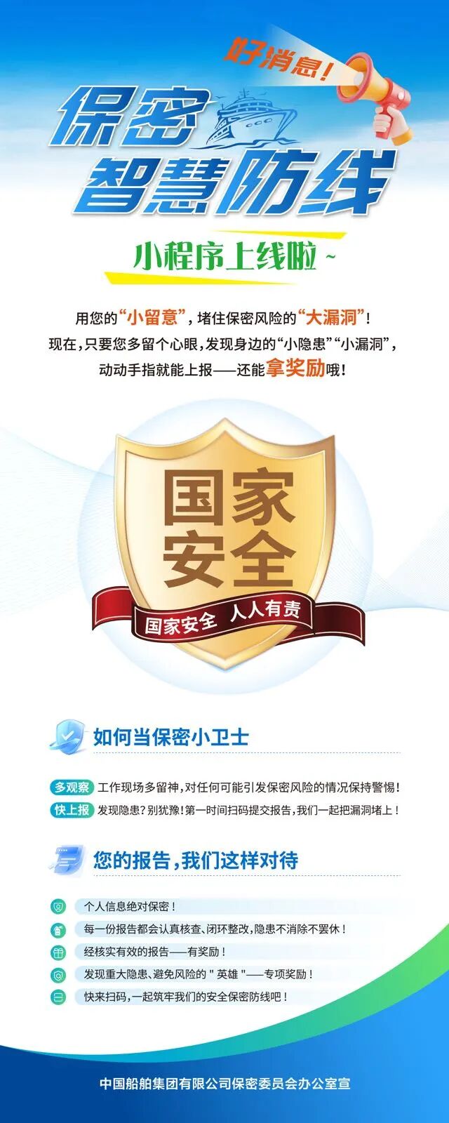 在第十一個全民國家安全教育日到來之際,為深入貫徹落實總體國家安全觀,中國船舶集團有限公司“保密智慧防線”小程序正式上線運行。