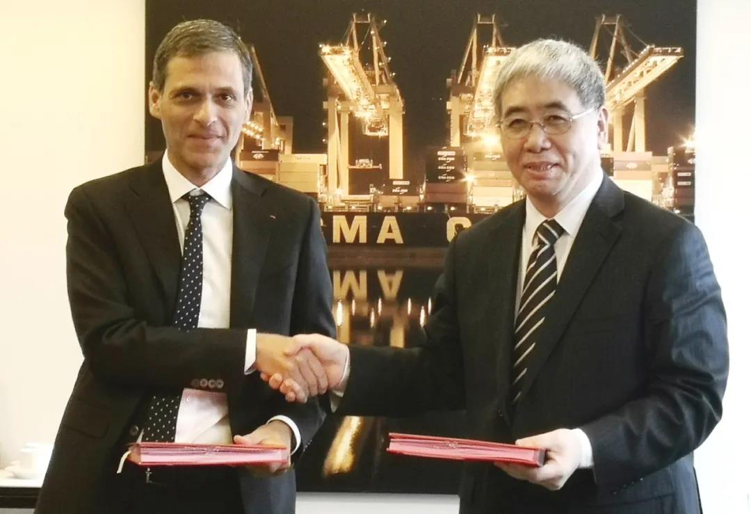 中國船舶集團董事長雷凡培、達飛集團董事長兼首席執行官魯道夫·薩德互換簽約文本