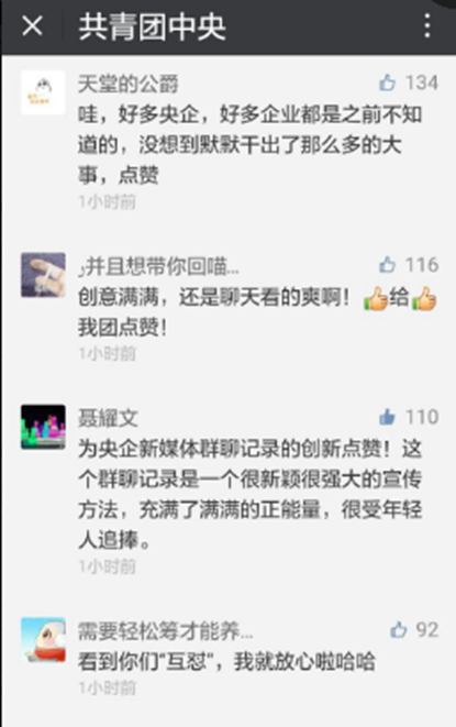 “‘央企新媒體群聊記錄’刷屏是央企新媒體親民傳播風(fēng)格的正向反饋,能引發(fā)受眾共鳴的話(huà)題加上激發(fā)和感染的受眾,從而引發(fā)了積極的再傳播力量”,人民網(wǎng)輿情監(jiān)測(cè)室常務(wù)副秘書(shū)長(zhǎng)單學(xué)剛同樣不諱受眾在其中的作用。