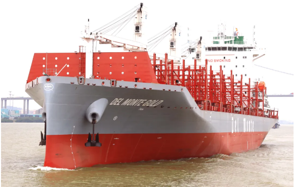 近日,中國船舶集團旗下黃埔文沖為美國Del Monte公司建造的600FEU全冷藏集裝箱船首制船“DEL MONTE GOLD”號交付。該型船總長192米,型寬30米,設計吃水9.3米,為國際遠洋冷藏集裝箱船,全部貨柜箱均為冷藏集裝箱,是一款冷箱量大、裝載靈活、便于維護的綠色環保型船舶。