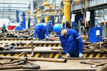 廣船國際首個吸力筒導管架風機基礎施工現場,技術工人正在進行管子焊接作業。