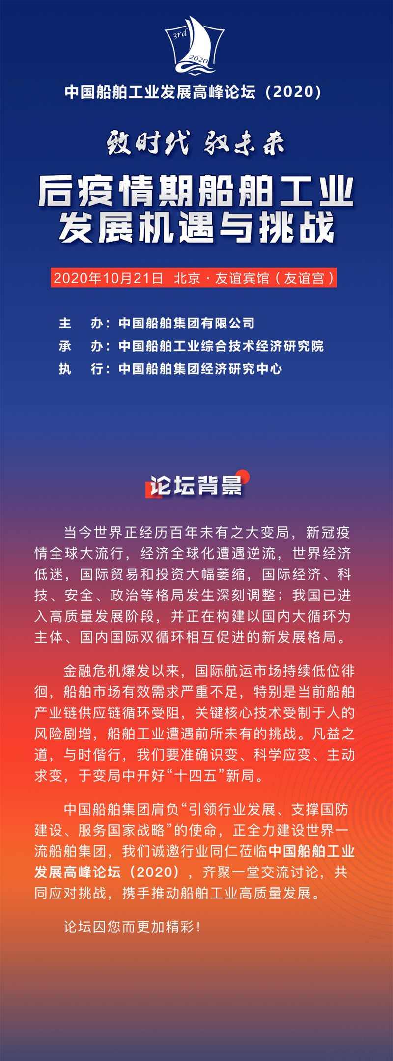 中國船舶集團肩負“引領(lǐng)行業(yè)發(fā)展、支撐國防建設(shè)、服務(wù)國家戰(zhàn)略”的使命,正全力建設(shè)世界一流船舶集團,我們誠邀行業(yè)同仁蒞臨中國船舶工業(yè)發(fā)展高峰論壇(2020),齊聚一堂交流討論,共同應(yīng)對挑戰(zhàn),攜手推動船舶工業(yè)高質(zhì)量發(fā)展。