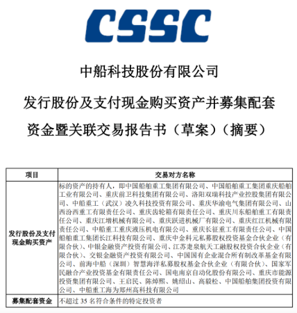 10月10日,中國船舶集團有限公司旗下上市公司中船科技股份有限公司發(fā)布《發(fā)行股份及支付現(xiàn)金購買資產(chǎn)并募集配套資金暨關聯(lián)交易報告書(草案)》等公告。根據(jù)公告,中船科技擬通過發(fā)行股份及支付現(xiàn)金的方式購買交易對方持有的交易作價合計約為91.98億元的標的資產(chǎn),并擬非公開發(fā)行股票募集不超過30億元的配套資金。該草案的公布標志著中船科技重大資產(chǎn)重組取得具有里程碑意義的重要進展。