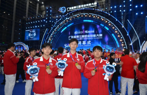 王建華(焊接-世賽選拔廣東省賽第1名,左)、歐雙朋(焊接-國賽精選廣東省賽第1名,中)、吳志平(建筑金屬構(gòu)造-世賽選拔廣東省賽第1名,右)