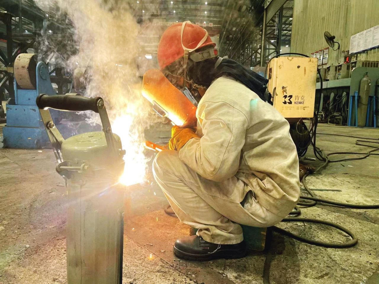 武漢船機——鋼構制造部員工穿著厚厚的防護服進行焊接工作。