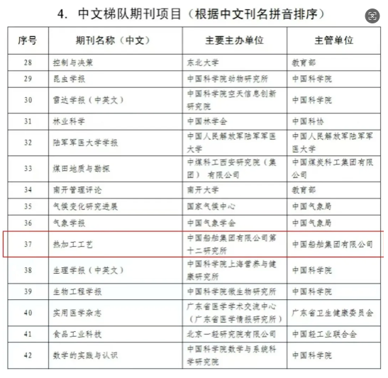 近日,中國(guó)科技期刊卓越行動(dòng)計(jì)劃二期(2024—2028年)入選結(jié)果公布,由中國(guó)船舶集團(tuán)有限公司主管、中國(guó)船舶集團(tuán)第十二研究所和中國(guó)造船工程學(xué)會(huì)聯(lián)合主辦的《熱加工工藝》期刊,成功入選“中文梯隊(duì)期刊”項(xiàng)目。這也是中國(guó)船舶集團(tuán)唯一成功入選卓越行動(dòng)計(jì)劃二期的期刊。
