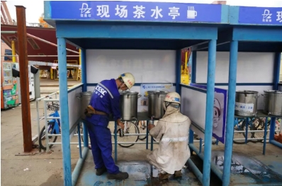 江南造船為一線員工送棒冰、鹽汽水、酸梅湯、水壺等物資,食堂開設(shè)綠豆湯專供窗口,生產(chǎn)區(qū)域設(shè)置115個(gè)大麥茶供應(yīng)點(diǎn),遍布各車間、碼頭、休息區(qū);提前策劃,按就近、共享以及區(qū)域化管理原則,新增職工小家,開放辦公樓宇和食堂,設(shè)置高溫休息點(diǎn)。