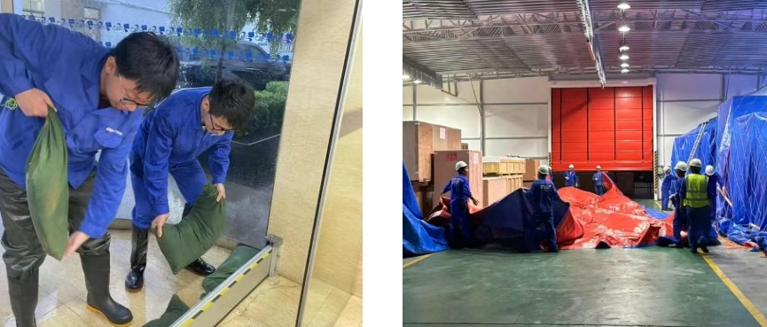 面對(duì)“竹節(jié)草”臺(tái)風(fēng)的洶洶來襲,中船動(dòng)力迅速組織下屬單位滬東重機(jī)、中船三井等開展全方位防汛防臺(tái)工作,筑牢安全屏障。中船三井集配倉庫應(yīng)急小組24小時(shí)值守,提前加固倉庫設(shè)施、轉(zhuǎn)移零件木箱,逐一加蓋雨布和網(wǎng)罩,形成“防雨+防風(fēng)”的雙重保護(hù)體系。滬東重機(jī)青年突擊隊(duì)迅速集結(jié),針對(duì)地勢(shì)低洼的車間、辦公樓和物流通道,安裝了鋼制擋水板和防汛沙袋。