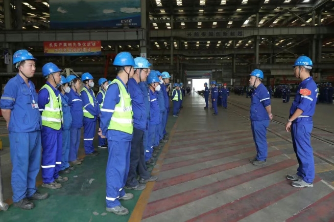 武昌造船、中船澄西、中船物資、中船動(dòng)力和汾西重工等單位按照“五步法”召開班前會(huì),確認(rèn)人員狀態(tài)及勞保防護(hù)裝備;分享安全案例,剖析隱患;細(xì)化工作任務(wù),標(biāo)注風(fēng)險(xiǎn),明確應(yīng)急流程;隨機(jī)抽查復(fù)述,組員互查要點(diǎn);全員齊喊安全或精益口號(hào),提振士氣。
