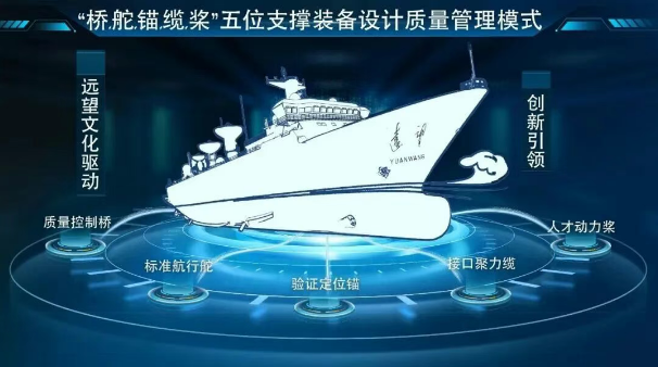 基于“全自主研發”和“巨系統抓總”的問題導向,七〇八所“遠望”研發創新團隊凝聚智慧和力量,以創新為引領、以遠望文化為驅動,提煉了“橋、舵、錨、纜、槳”五位支撐裝備設計質量管理模式。各項核心管理要素相互作用、五位支撐裝備研發設計過程,構建形成了一個良好向上、持續提升的團隊質量管理機制,為確保裝備研制質量奠定了堅實基礎。“橋”是“艦橋”的簡稱,是艦船駕駛控制、觀察及決策的主要設施,其作用如同質量控制。“舵”是控制艦船航行方向的主要設備,其作用如同規范指引。“錨”作為艦船停泊和定位的主要設備,其作用如同試驗驗證。“纜”作為艦船靠幫連接的主要設備,其作用如同接口管理。“槳”是提供艦船航行動力的主要設備,其作用如同人才保障。