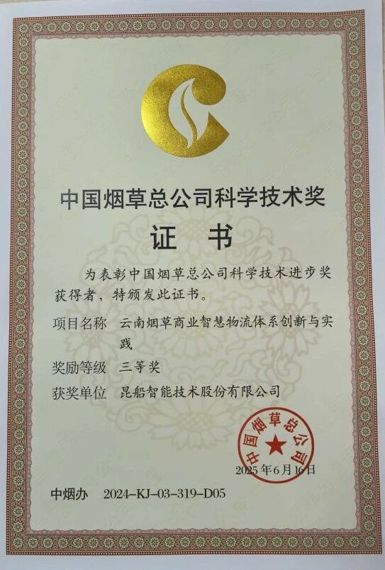 近日,中船集團(tuán)旗下昆船公司所屬昆船智能協(xié)同相關(guān)單位及高校申報(bào)的“云南煙草商業(yè)智慧物流體系創(chuàng)新與實(shí)踐”項(xiàng)目成果獲得中國(guó)煙草總公司科技進(jìn)步獎(jiǎng)三等獎(jiǎng)。