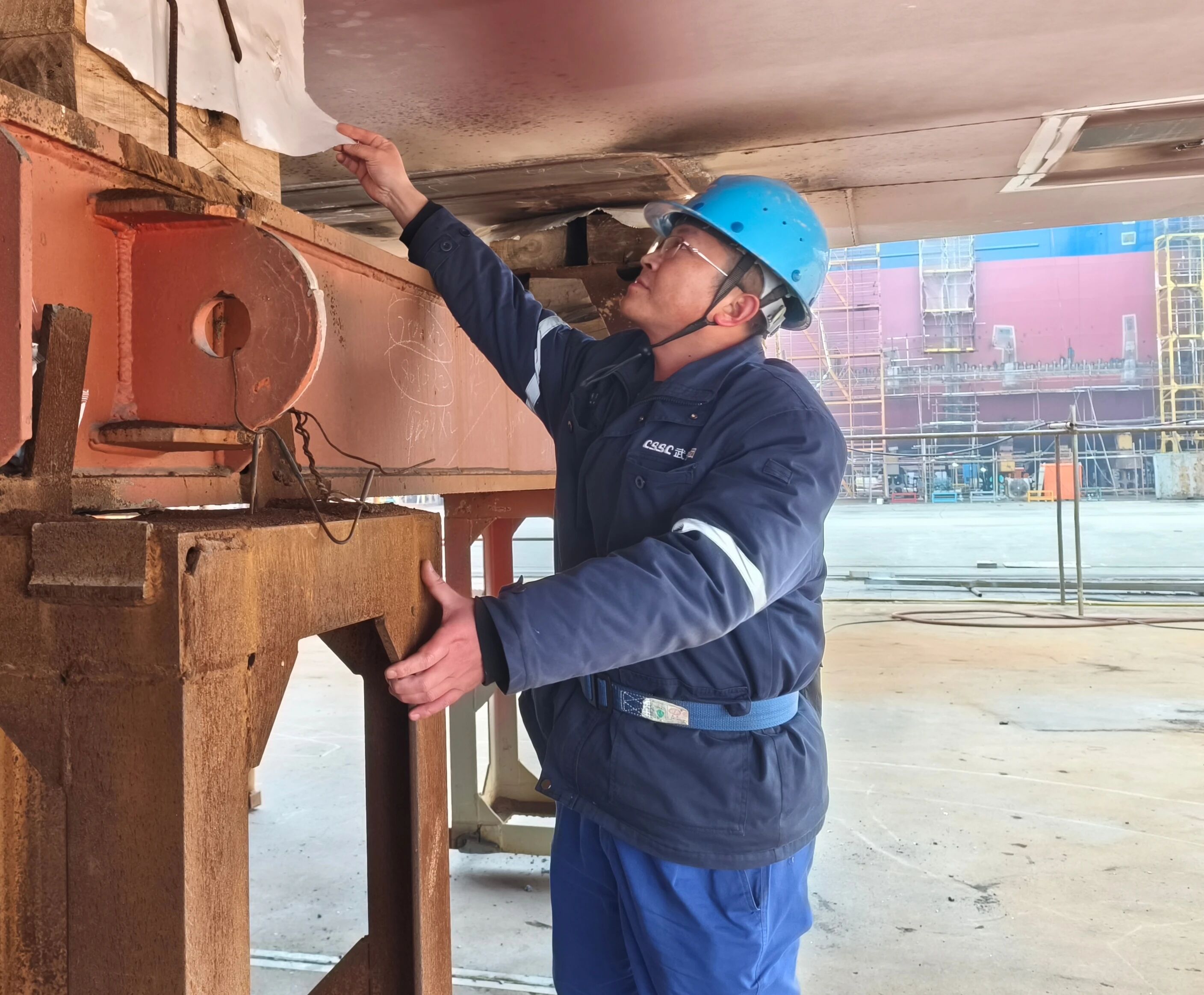 正在進(jìn)行例行巡檢的船舶總裝部船臺(tái)車(chē)間生產(chǎn)調(diào)度員楊華,突然發(fā)現(xiàn)船臺(tái)現(xiàn)場(chǎng)的一座門(mén)架出了問(wèn)題。