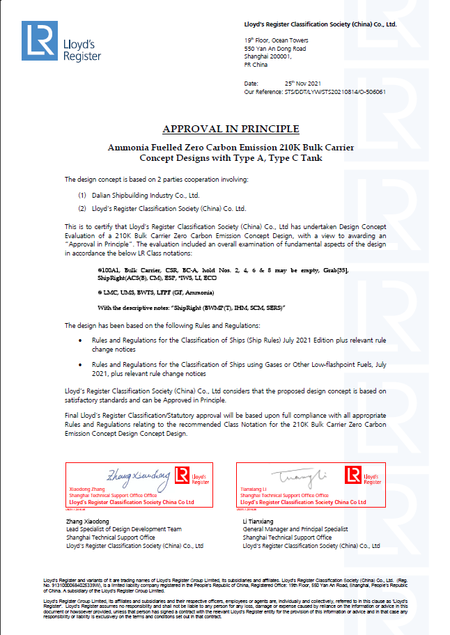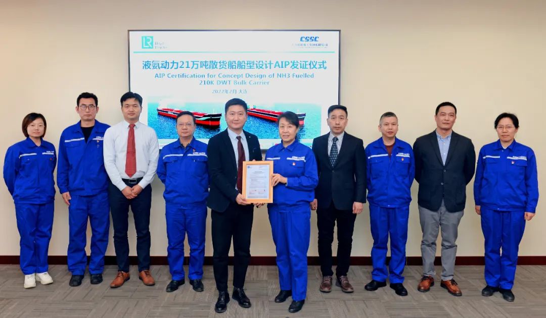 2月25日,中國船舶集團(tuán)旗下大船集團(tuán)最新研發(fā)的液氨動力21萬噸散貨船設(shè)計方案,獲英國勞氏船級社(LR)原則性認(rèn)可(AIP)證書。