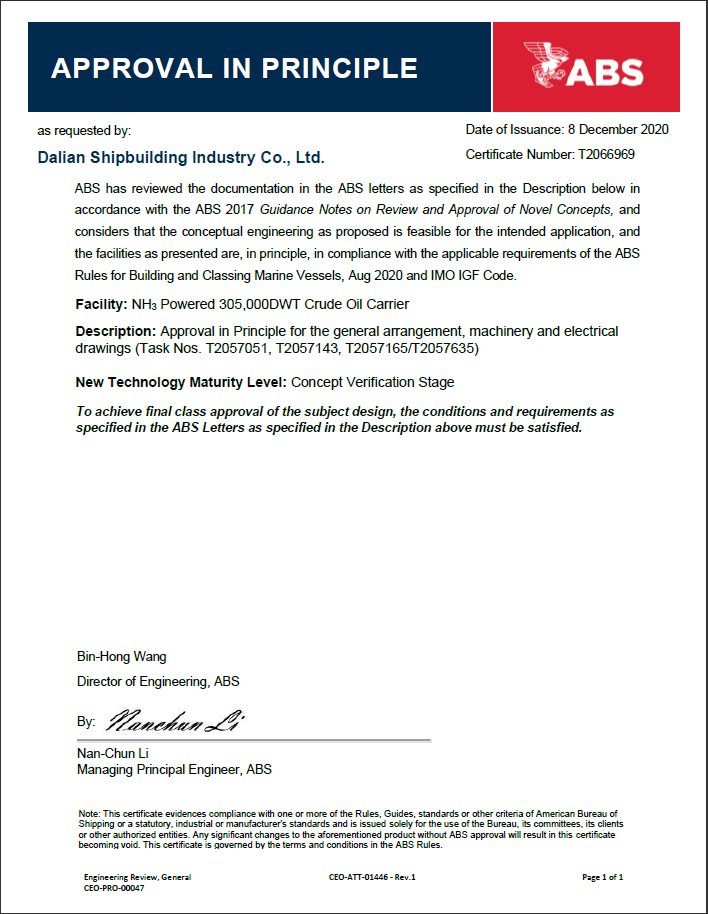 2020年,大船集團(tuán)研發(fā)的液氨動力超大型油船(VLCC)分別取得美國船級社(ABS)和中國船級社(CCS)頒發(fā)的AIP證書。