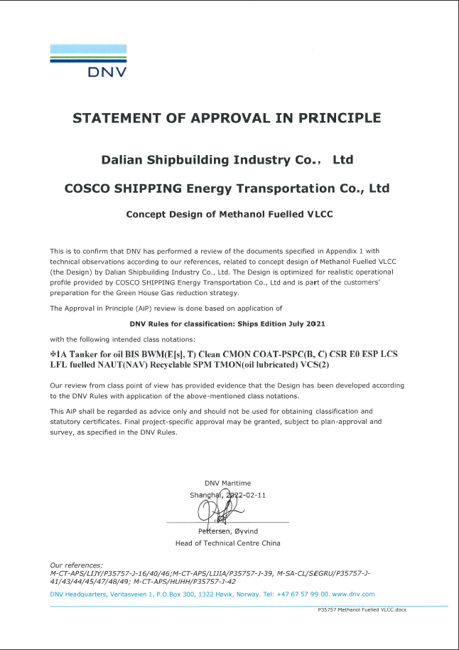 甲醇燃料VLCC分別獲得DNV、CCS船級社AIP認(rèn)可。