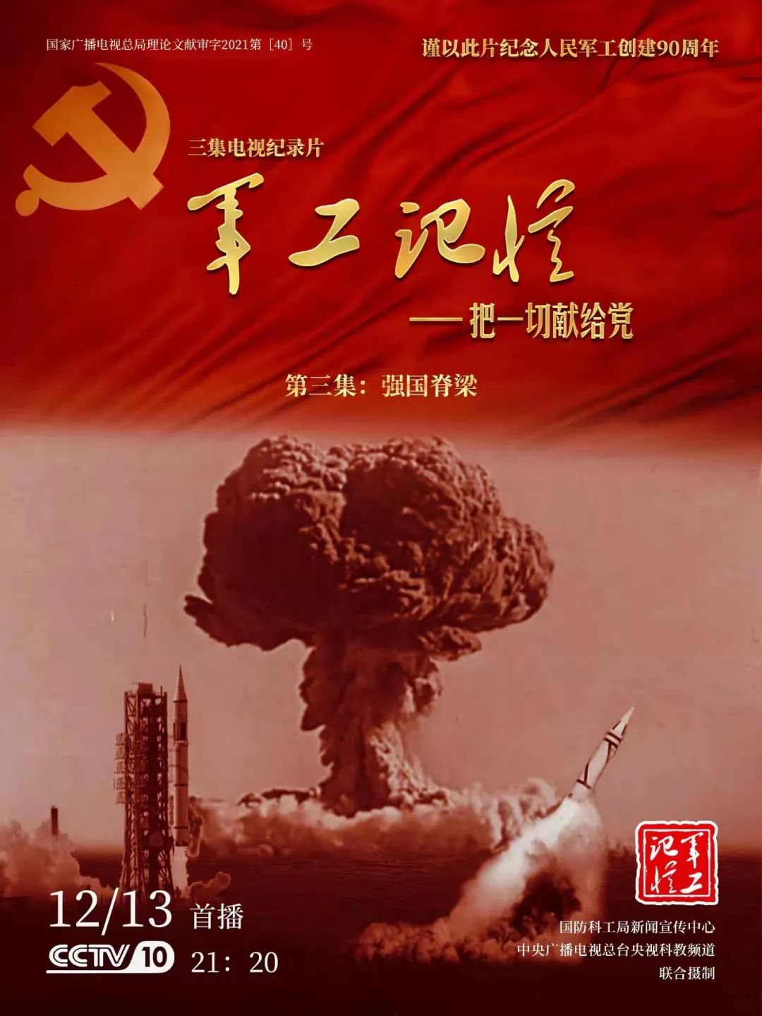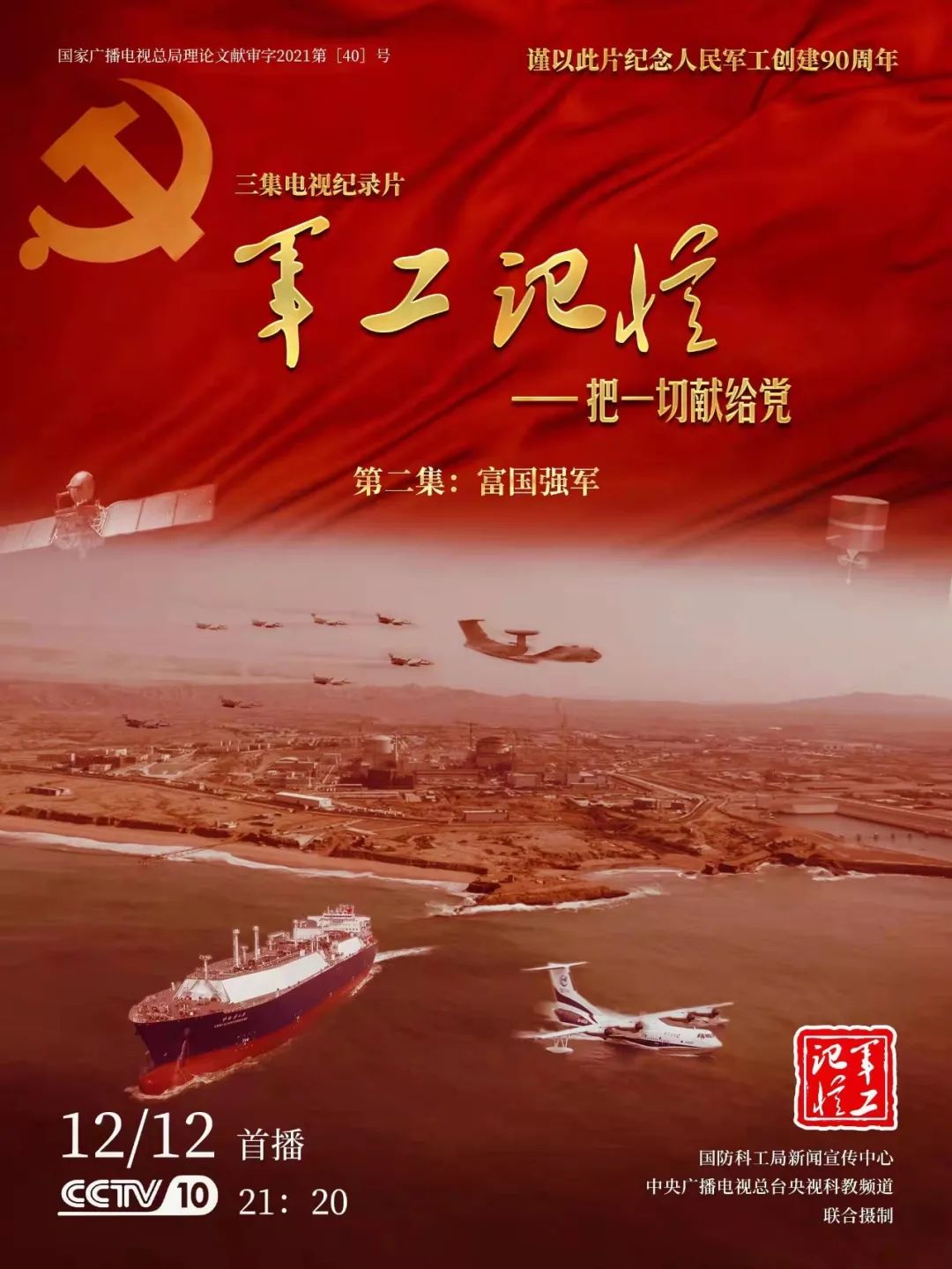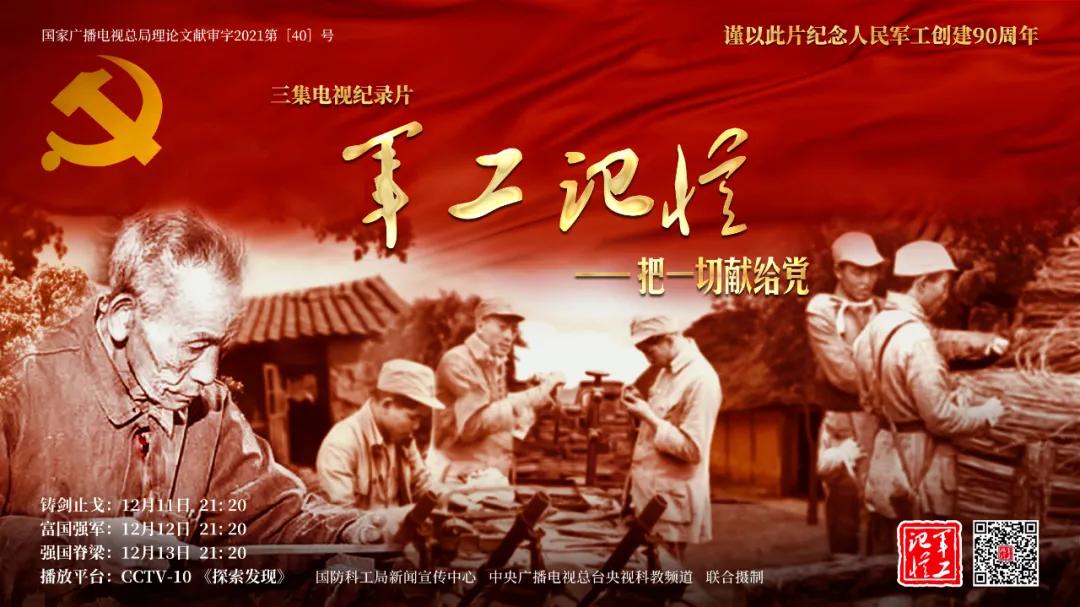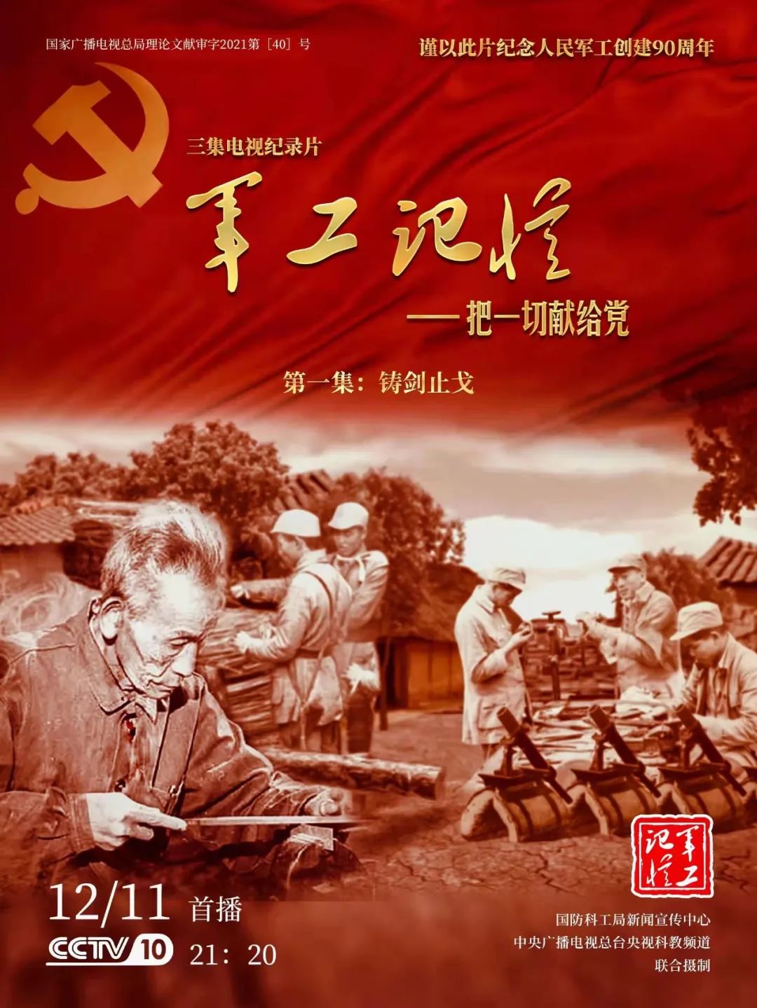 為慶祝中國(guó)共產(chǎn)黨成立100周年,紀(jì)念黨領(lǐng)導(dǎo)下的人民軍工創(chuàng)建90周年,由國(guó)防科工局指導(dǎo),國(guó)防科工局新聞宣傳中心聯(lián)合中央廣播電視總臺(tái)社教節(jié)目中心攝制,各軍工集團(tuán)大力支持的3集重大理論文獻(xiàn)電視紀(jì)錄片《軍工記憶——把一切獻(xiàn)給黨》,將于12月11日21:20在央視科教頻道(CCTV-10)《探索發(fā)現(xiàn)》欄目首播,連續(xù)播出3天。該紀(jì)錄片旨在向建黨百年獻(xiàn)禮,向人民軍工90周年致敬,向全社會(huì)弘揚(yáng)軍工精神傳遞軍工文化,激勵(lì)國(guó)防科技工業(yè)戰(zhàn)線(xiàn)廣大干部職工不忘初心、接續(xù)奮斗,為實(shí)現(xiàn)強(qiáng)軍強(qiáng)國(guó)夢(mèng)想貢獻(xiàn)力量。