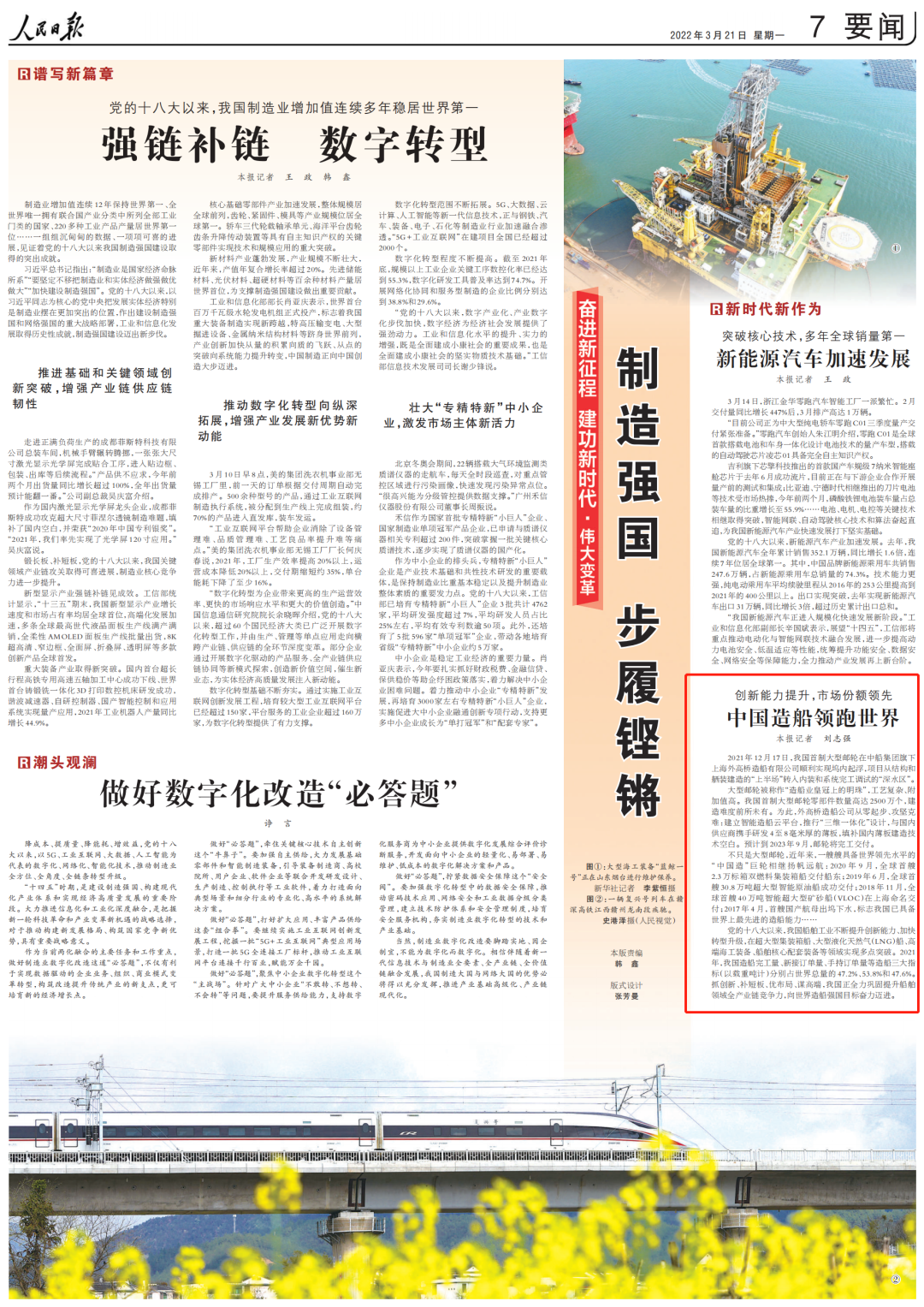 黨的十八大以來,我國船舶工業(yè)不斷提升創(chuàng)新能力、加快轉(zhuǎn)型升級,在超大型集裝箱船、大型液化天然氣(LNG)船、高端海工裝備、船舶核心配套裝備等領域?qū)崿F(xiàn)多點突破。2021年,我國造船完工量、新接訂單量、手持訂單量等造船三大指標(以載重噸計)分別占世界總量的47.2%、53.8%和47.6%。抓創(chuàng)新、補短板、優(yōu)布局、謀高端,我國正全力鞏固提升船舶領域全產(chǎn)業(yè)鏈競爭力,向世界造船強國目標奮力邁進。