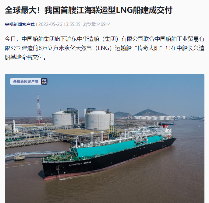 5月26日,中國船舶集團旗下滬東中華聯(lián)合中船貿(mào)易建造的8萬立方米液化天然氣(LNG)運輸船“傳奇太陽”號在長興造船基地命名交付。“傳奇太陽”號是全球最大淺水航道第四代、我國首款首制首艘江海聯(lián)運型LNG船,填補了中國淺水航道LNG船的空白,在該細分市場占有率最高,有望成為中國船舶制造的又一精品船型。