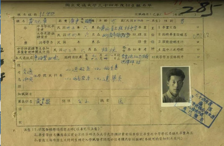 “國立交通大學”這所當時在科學技術(shù)領(lǐng)域全國首屈一指的學術(shù)殿堂,在黃旭華心中是神圣而遙遠的。以至于當真正有機會填寫被保送大學的名字時,他竟然沒有勇氣填上“國立交通大學”的名字,只填上了一個中央大學的航空系。