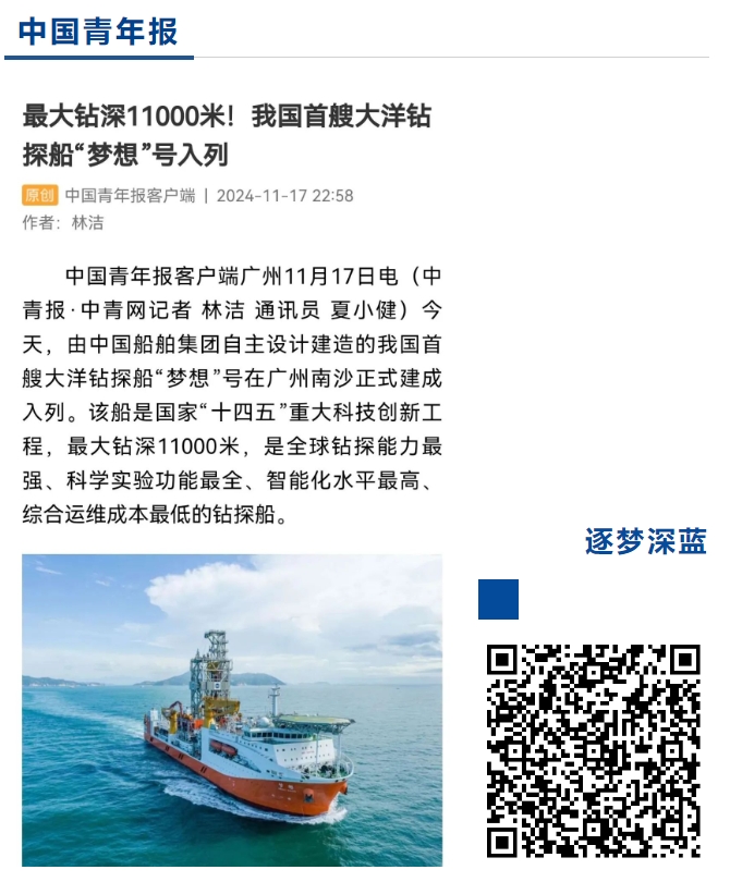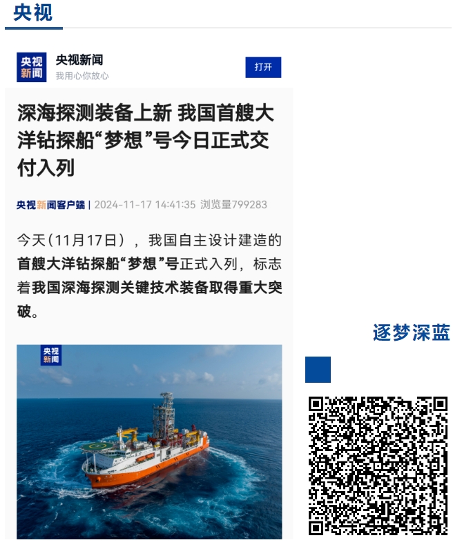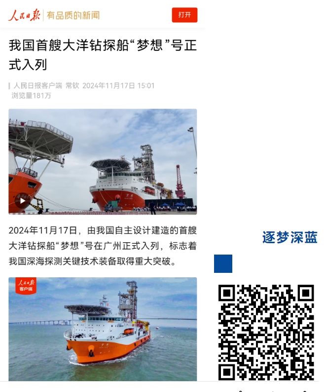 11月17日,中國船舶集團(tuán)自主設(shè)計(jì)建造的我國首艘大洋鉆探船“夢想”號在廣州南沙交付入列,人民日報(bào)、新華社、央視等媒體的記者來到交付現(xiàn)場進(jìn)行報(bào)道 。
