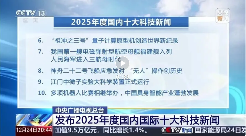 12月24日,中央廣播電視總臺發(fā)布2025年度國內(nèi)十大科技新聞,我國第一艘電磁彈射型航空母艦福建艦入列人民海軍進(jìn)入三航母時代位列其中。