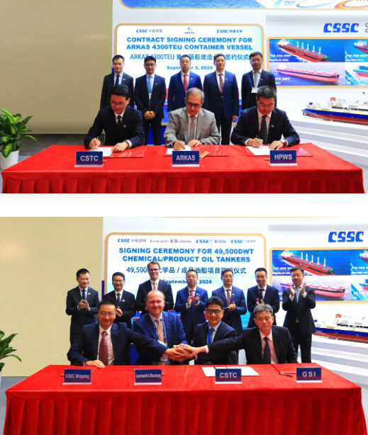 此次展會上,集團(tuán)公司有關(guān)成員單位負(fù)責(zé)人率隊赴展會開展重點(diǎn)船海項目經(jīng)營洽談并拜訪當(dāng)?shù)睾椭苓厙抑饕蛻?。集團(tuán)公司以“高端綠色、領(lǐng)跑未來”為參展主題,展臺設(shè)置了集團(tuán)總體區(qū)、高端綠色船舶區(qū)、先進(jìn)動力配套區(qū)共3個展示區(qū)域,重點(diǎn)展示了首艘國產(chǎn)大型郵輪、27.1萬立方米超大型LNG(液化天然氣)運(yùn)輸船、10800車LNG雙燃料汽車運(yùn)輸船、全球首艘LNG雙燃料VLCC(超大型油船)、21萬噸氨燃料散貨船、9.3萬立方米超大型全冷式液化氣船等一系列技術(shù)含量高、全球競爭力強(qiáng)的高端綠色船型,以及CPGC-WinGD 10X92DF-M甲醇雙燃料發(fā)動機(jī)、船用供氣系統(tǒng)、船用碳捕捉系統(tǒng)、船舶新能源動力系統(tǒng)解決方案等滿足IMO(國際海事組織)當(dāng)前和未來排放要求的先進(jìn)動力配套設(shè)備,充分彰顯了中國船舶集團(tuán)的國際化品牌形象及引領(lǐng)國際船舶市場創(chuàng)新發(fā)展的澎湃動力。